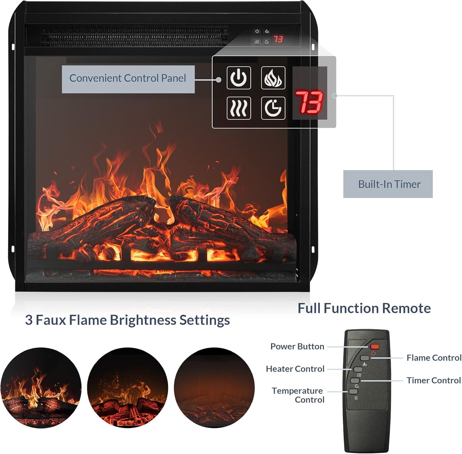 - Integrated 18" electric fireplace provides cozy warmth and ambient glow without smoke or ash, heating up to 400 sq ft.