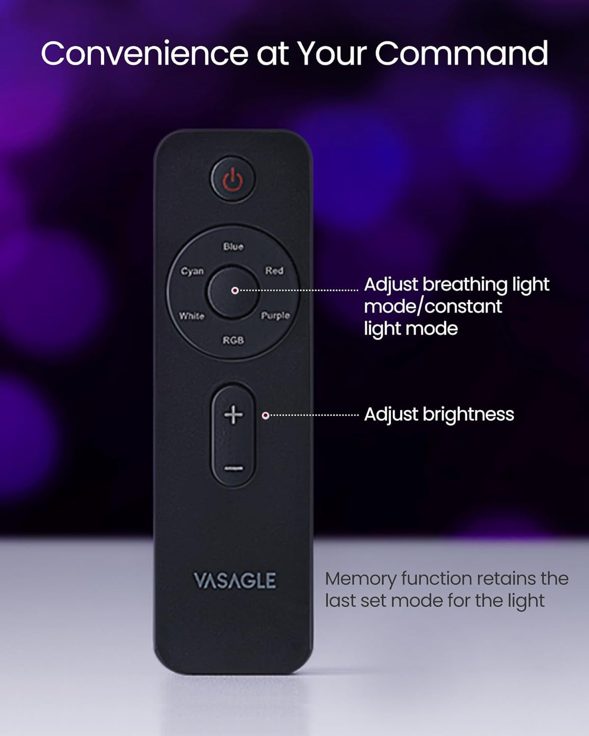 - Ambient LED Lighting: six color options create the perfect mood, controlled from up to 16.4 ft away with a remote. Choose static glow or dynamic breathing modes to match your scene.