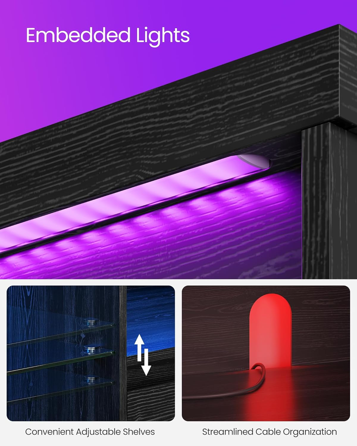 - Versatile Storage: a balance of open glass shelves and two enclosed cabinets with doors, plus adjustable glass shelves to fit consoles, media players, and decor.