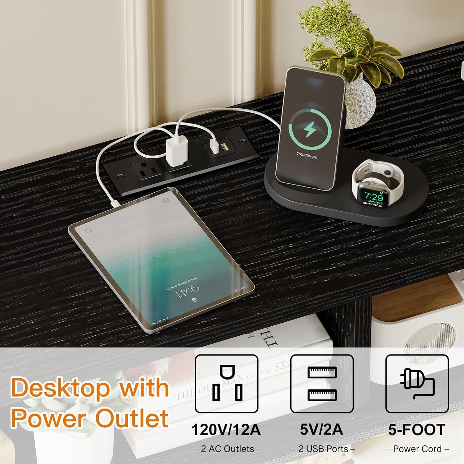 - Built-in power outlets for convenient device charging—two AC outlets and two standard ports keep cords out of sight.