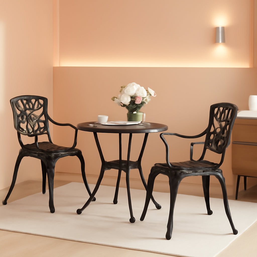 Transform your outdoor moments with a durable, rustproof 3-piece bistro set designed for small spaces. The Black Rustproof Bistro Set blends classic charm with all-weather performance thanks to its cast aluminum construction and black powder coating. It includes a round table with a 2-inch umbrella center hole and two comfortable chairs, perfect for patios, decks, balconies, and gardens.