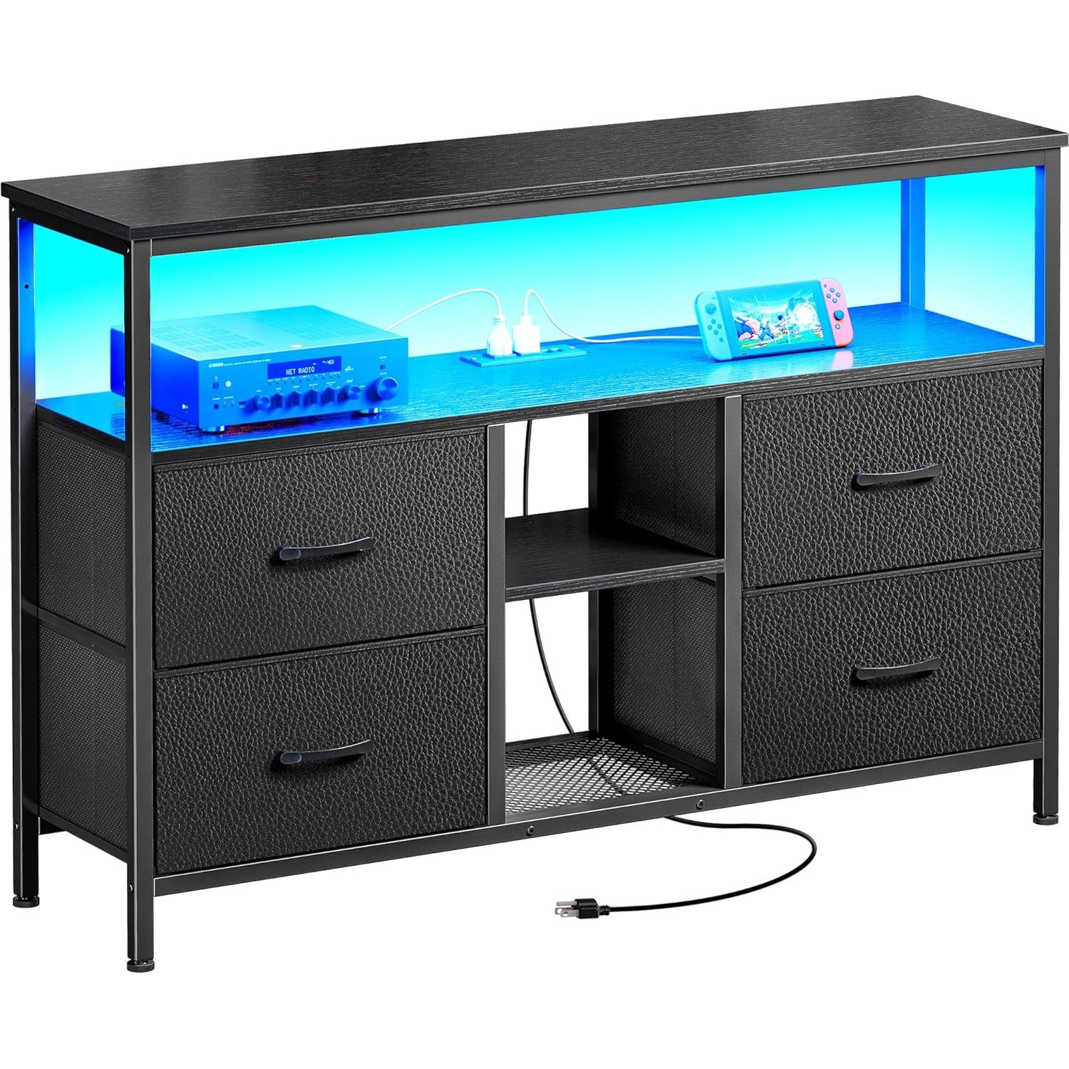 - Spacious storage includes 4 drawers and an open shelf, perfect for remotes, consoles, games, and media accessories.