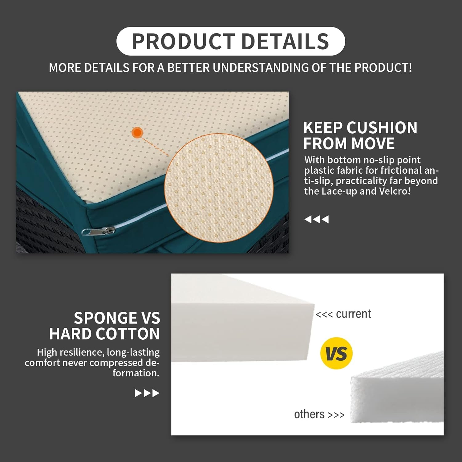 - 4-inch thick seat cushions with high-resilience foam and bottom anti-slip fabric; back cushions filled with PP cotton for enduring comfort.