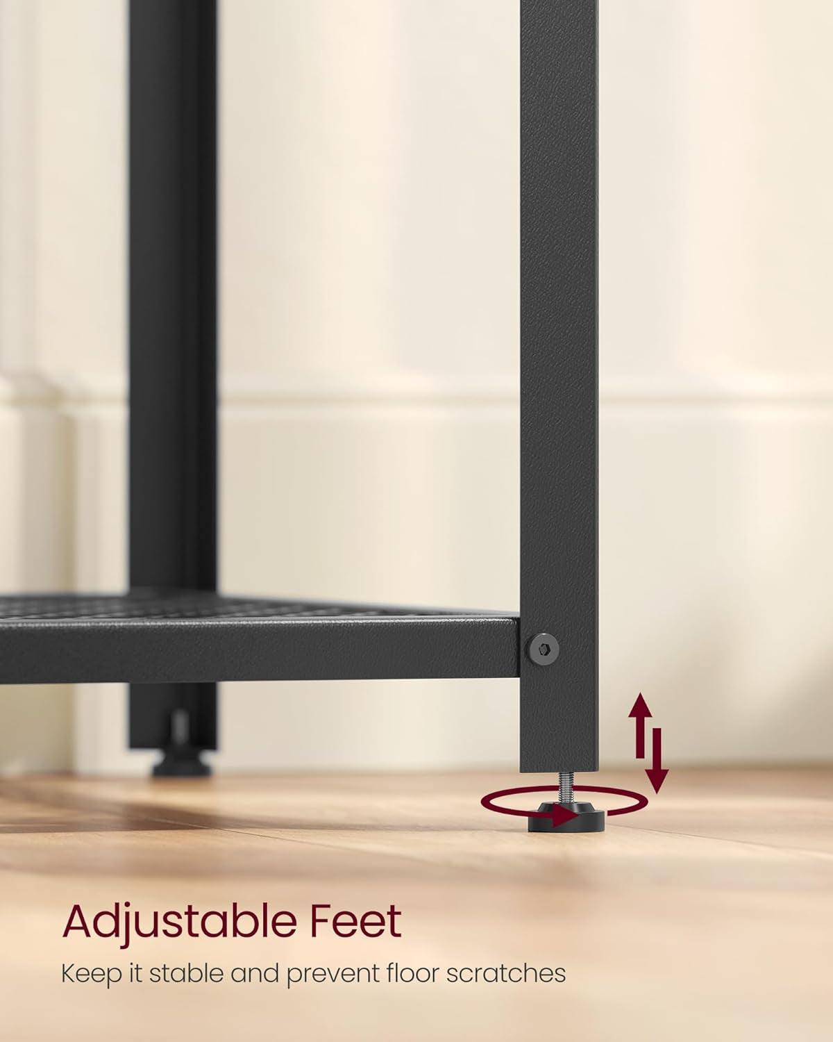 - Three-tier storage with an extra mesh shelf in the middle provides flexible space for devices, remotes, and decorative accents.