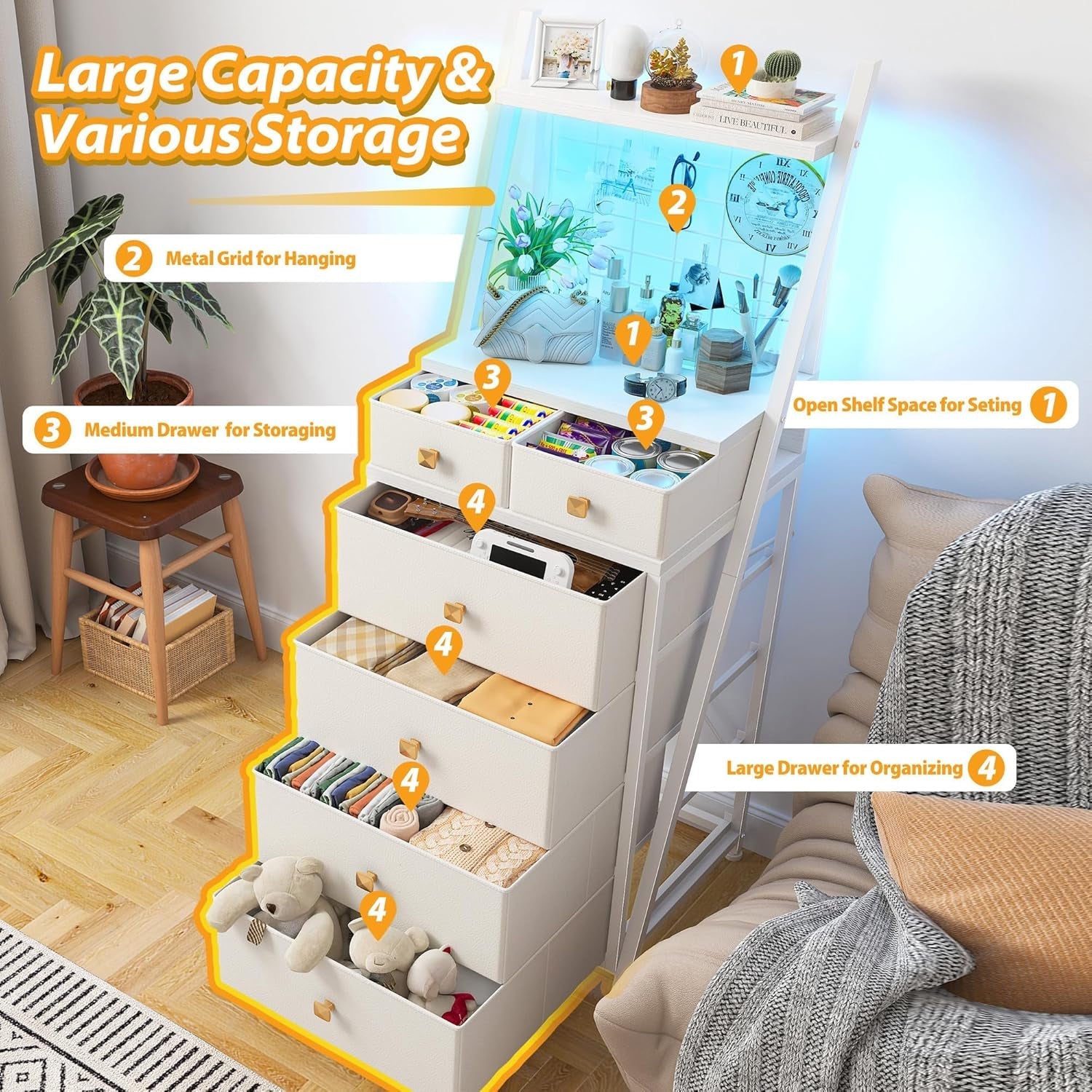 Organize with elegance and glow. This Vertical Dresser for Bedroom blends generous storage with ambient LED lighting, turning clutter into calm and transforming any room into a polished, inviting space.