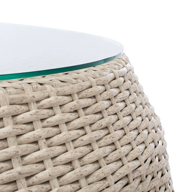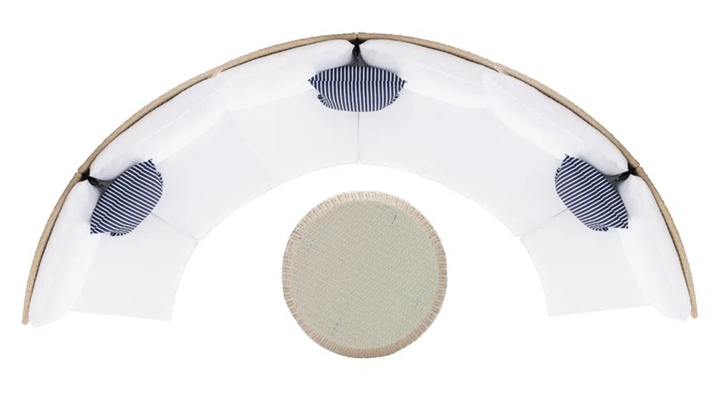 Three wicker two-seater benches form a graceful demilune around a barrel-shaped accent table, creating a balanced centerpiece that invites conversation and connection for six.